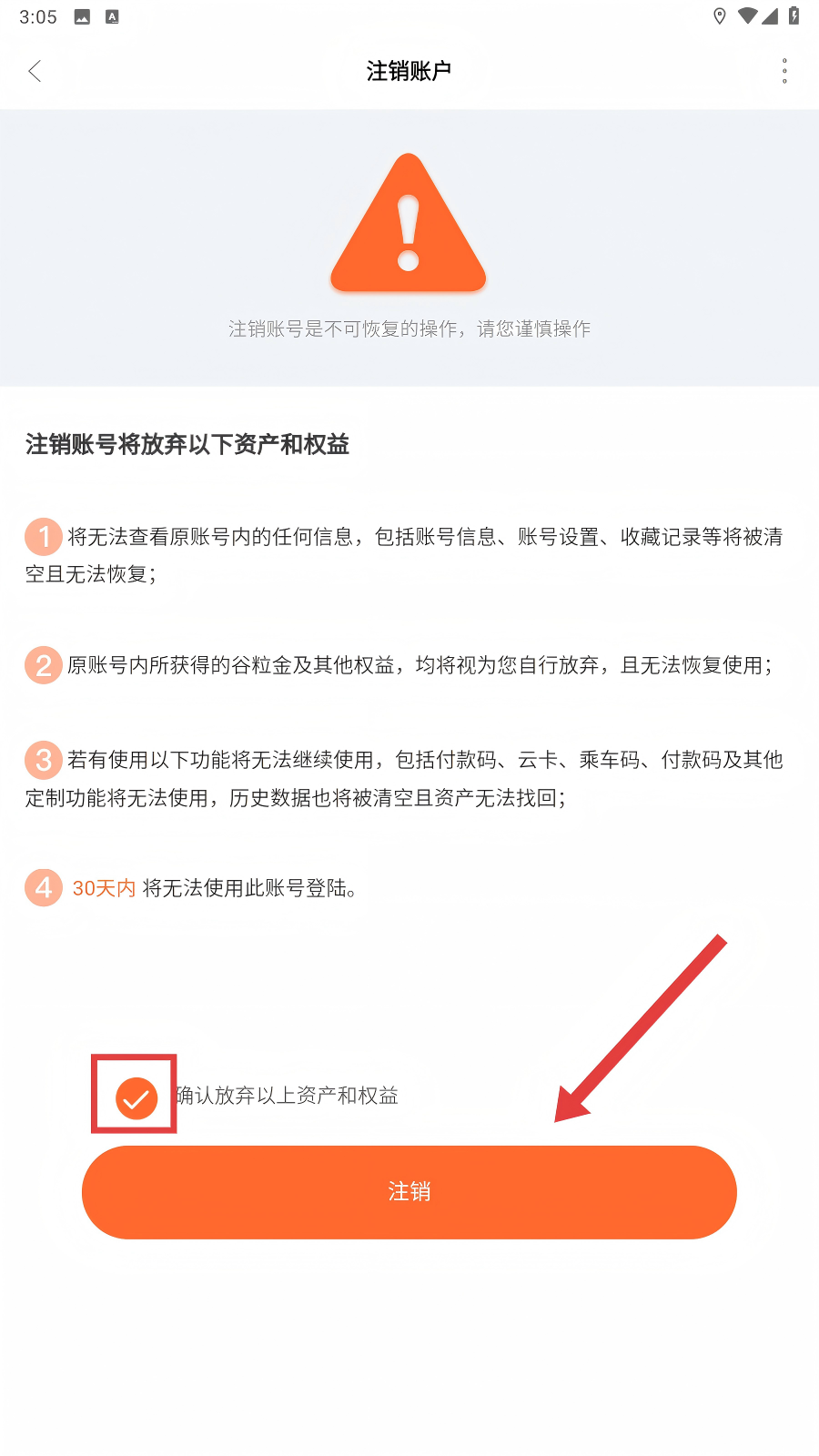 4、在注销账户界面,勾选【确认放弃以上资产和权益】,点击【注销】,即可完成账号注销操作啦。