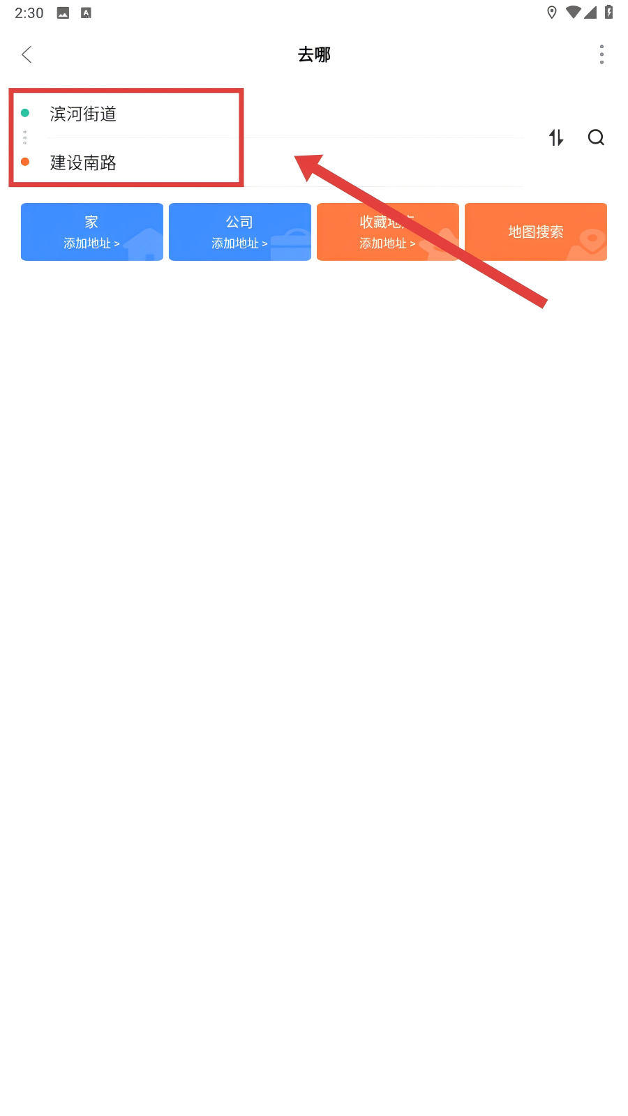2、在行程规划界面,选择起点如【滨河街道】和终点如【建设南路】,确定行程的起讫点哦。