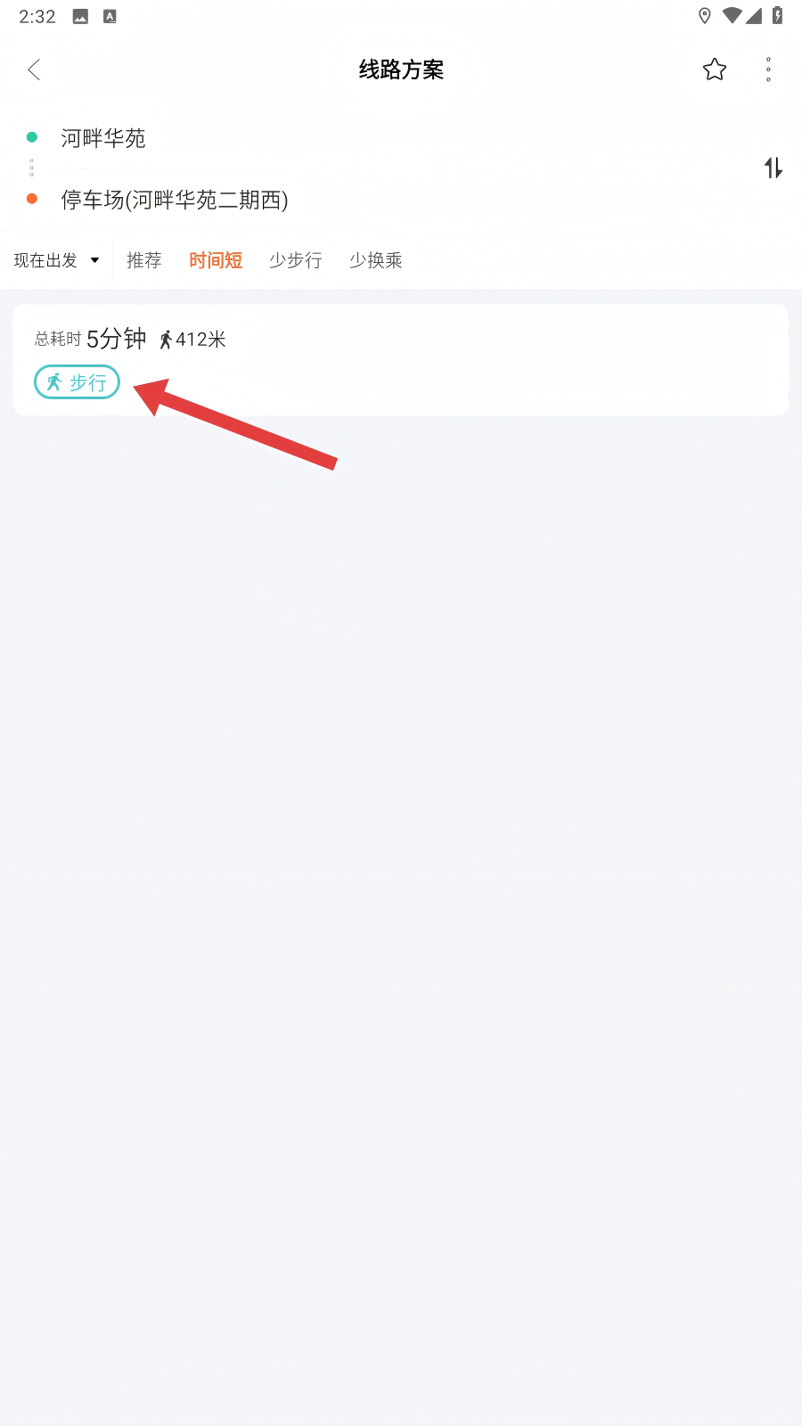 3、在线路方案中,点击【步行】选项,查看步行的总耗时和距离,获取步行出行方案啦。