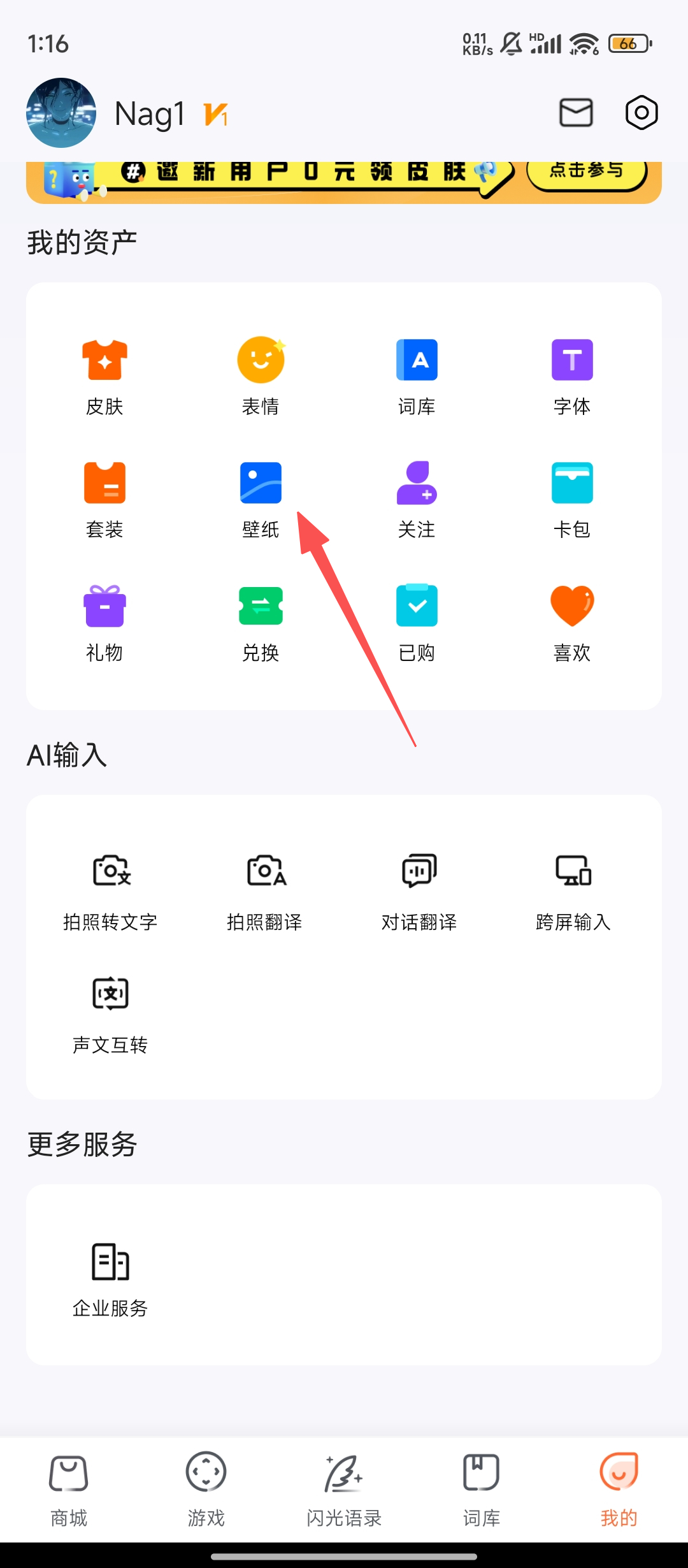 1、进入搜狗输入法【我的】页面,在【我的资产】区域点击【壁纸】图标,即可进入壁纸相关页面啦。