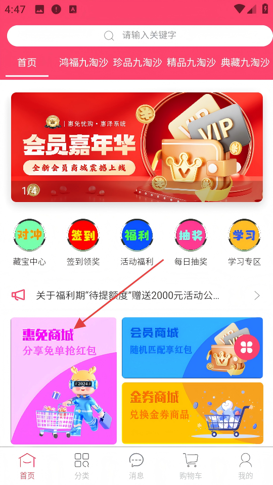 1、打开应用,在首页点击【惠免商城】,进入商品列表页面。