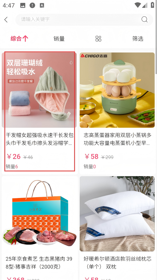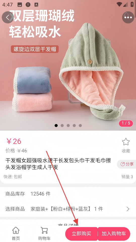 2、在商品列表页面,选择想要购买的商品,如【双层珊瑚绒干发帽】,点击进入商品详情页。