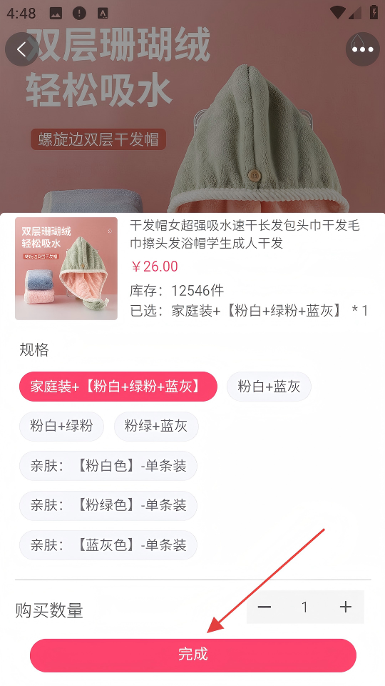 4、选择好规格和数量后,点击【完成】,完成商品购买操作。