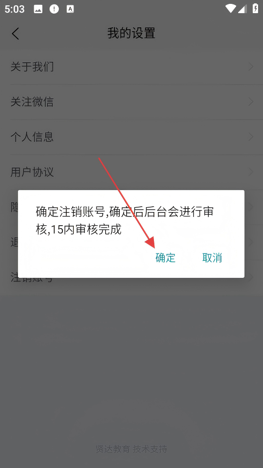 4、在弹出的确认注销账号提示框中,点击【确定】,后台会在15天内完成审核。