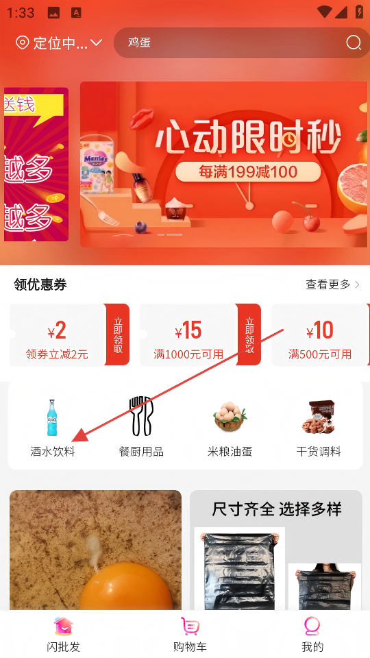 1、在软件首页,点击【酒水饮料】分类选项,进入商品列表页。