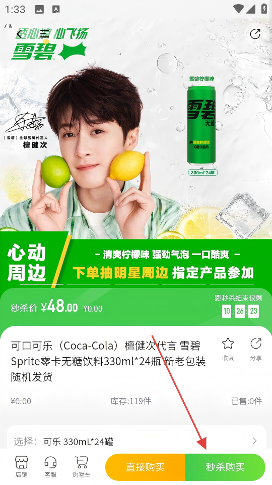 3、在商品详情页,查看信息后,点击【秒杀购买】按钮。