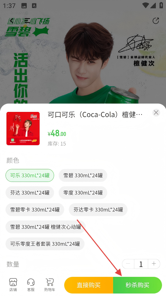 4、在弹出的选择界面选好规格和数量后,再次点击【秒杀购买】完成操作。