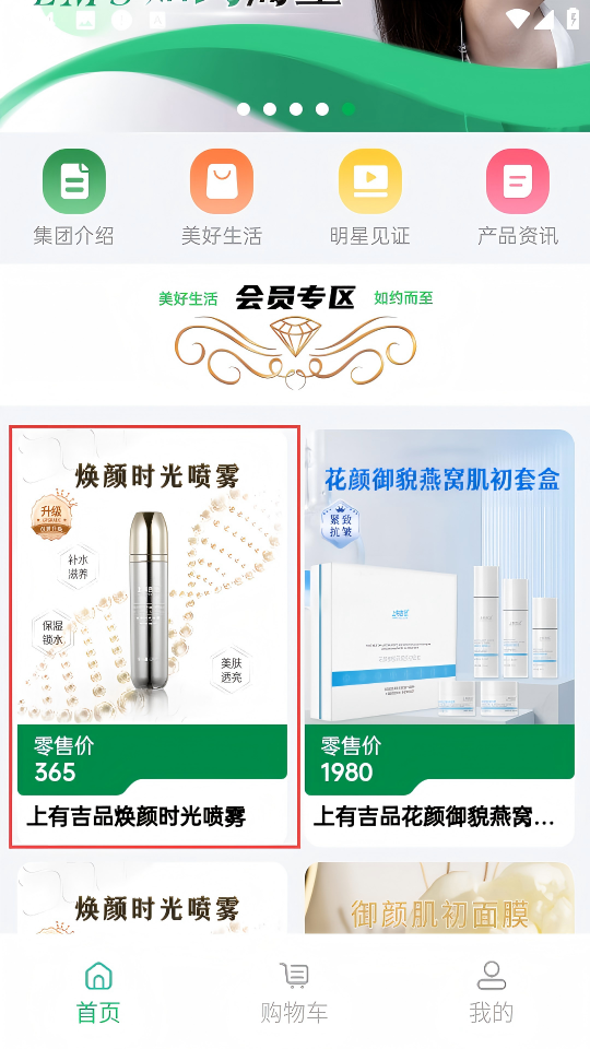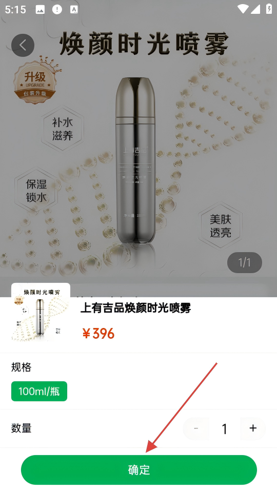 1、打开应用,在首页找到“上有吉品焕颜时光喷雾”商品,点击进入商品详情页。