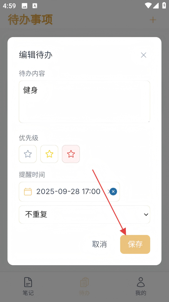 3、在“编辑待办”窗口中,填写待办内容,设置优先级、提醒时间等,点击【保存】。