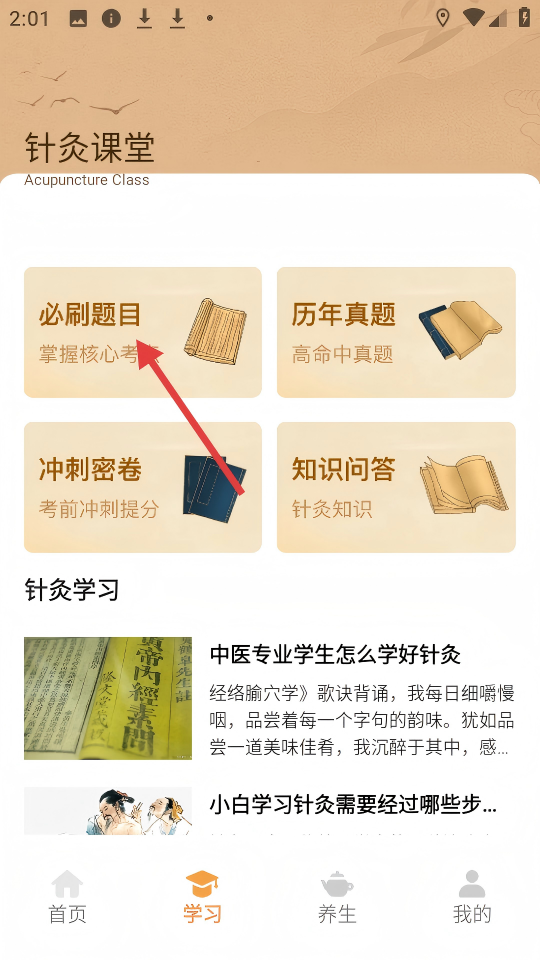 2、在【针灸课堂】页面,点击【必刷题目】,进入必刷题目答题页面。