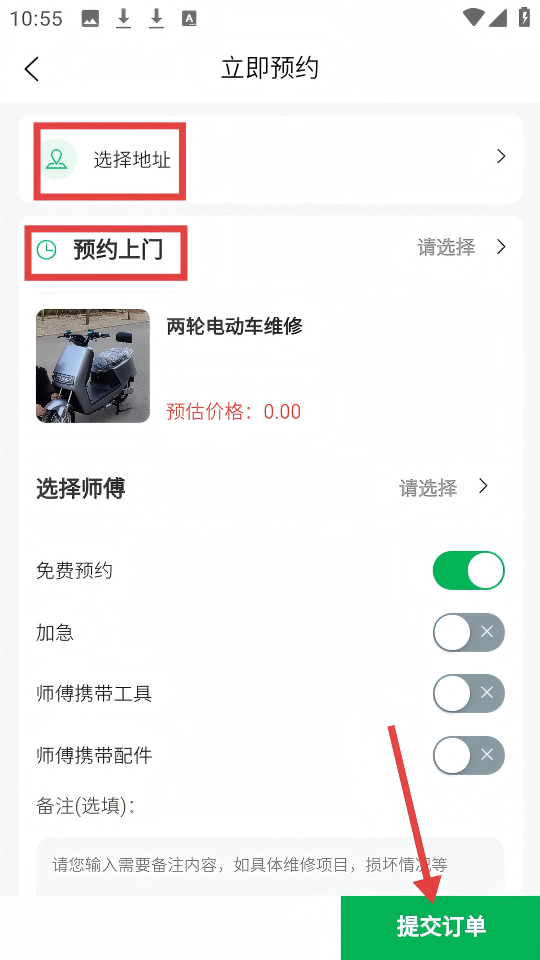 4、在【立即预约】页面,选择【地址】、设置【预约上门】时间,点击【提交订单】按钮。