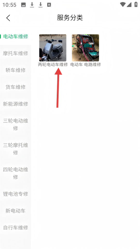 2、在【服务分类】页面,点击【两轮电动车维修】选项。