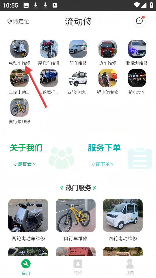 1、在流动修首页,点击【电动车维修】图标,进入服务分类页面。