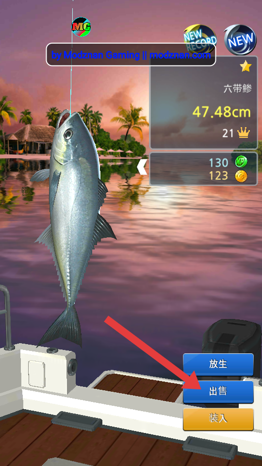 4、钓到鱼后,点击【出售】按钮,借助内置mod菜单获取更多金币和经验,快速提升钓鱼装备等级。