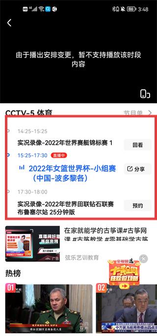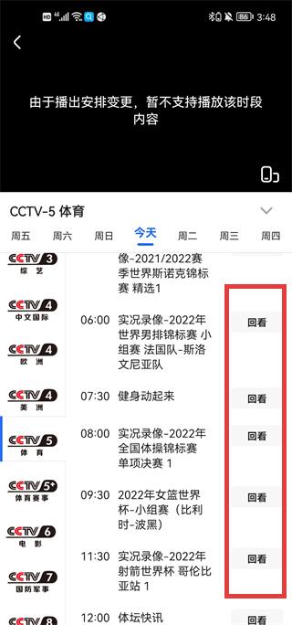 3、节目单中对错过节目点【回看】回顾内容(如女篮世界杯)。