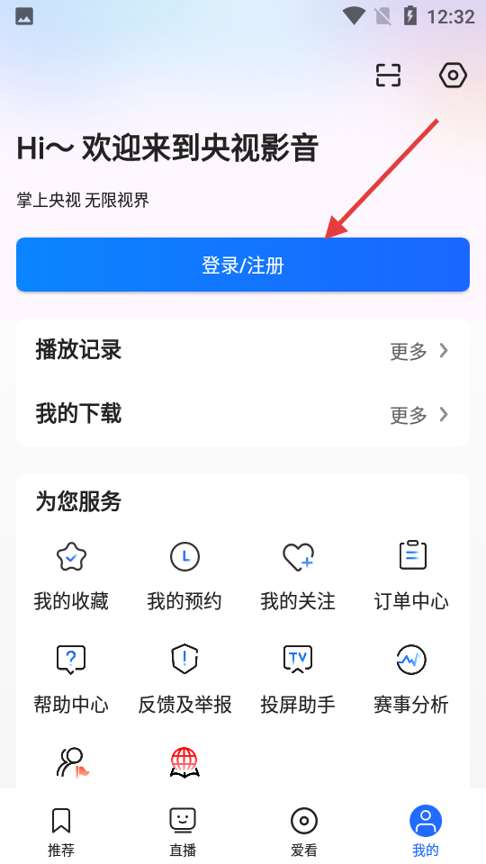 2、点击【登录/注册】,进入登录选择界面。