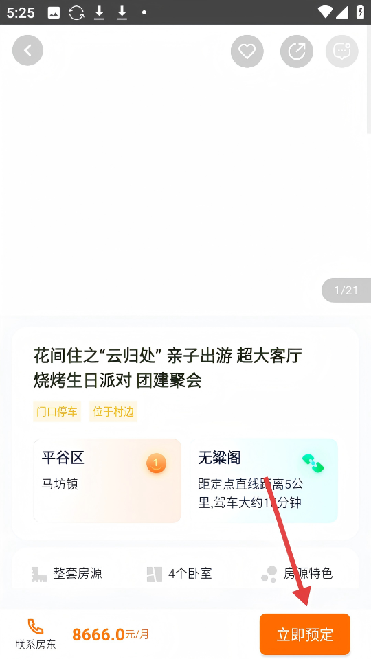 3、进入房源详情页后,点击右下角【立即预定】按钮。