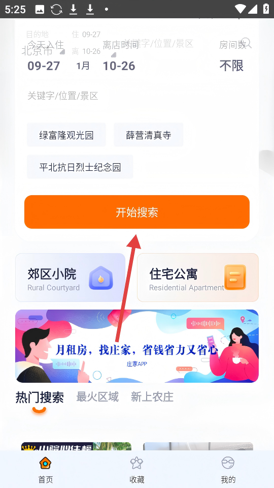 1、选择目的地、入住离店日期等信息后,点击【开始搜索】按钮。