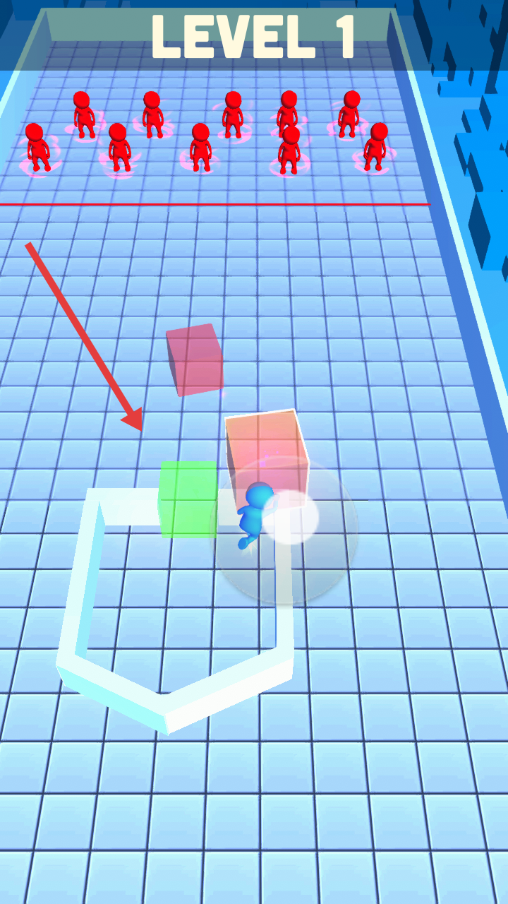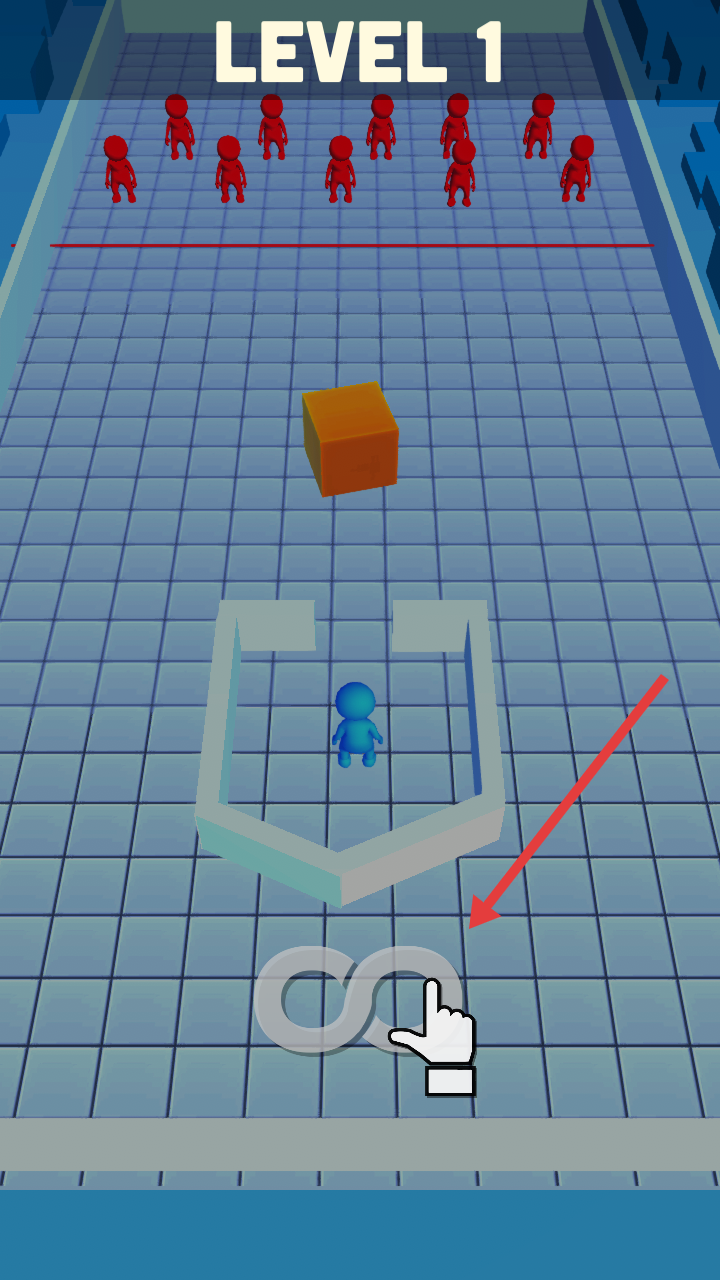 1、滑动屏幕控制蓝色小人移动,收集橙色方块,开始Level1的挑战。