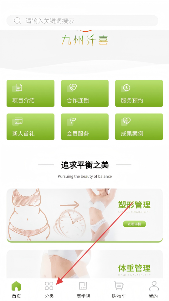 1、在“九州纤喜”APP首页,点击底部导航栏的【分类】按钮,进入商品分类页面。