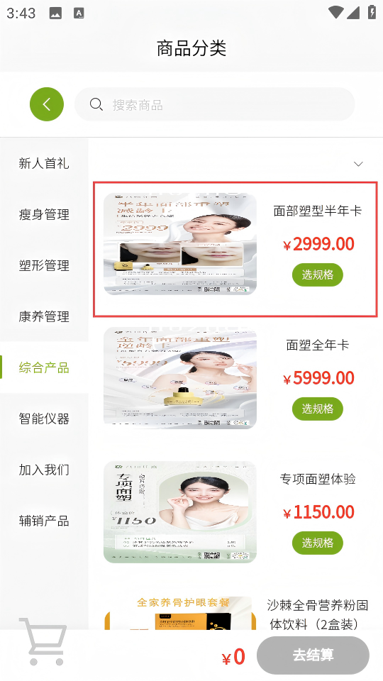2、在商品分类页面,选择【面部塑型半年卡】商品,进入其详情页。