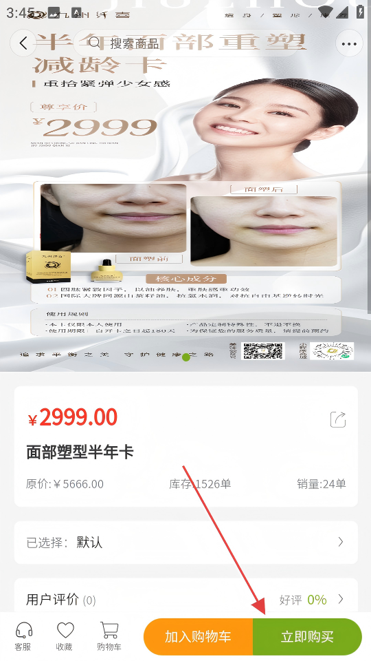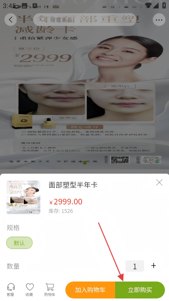3、在“面部塑型半年卡”商品详情页,点击【立即购买】按钮,弹出规格选择窗口。
