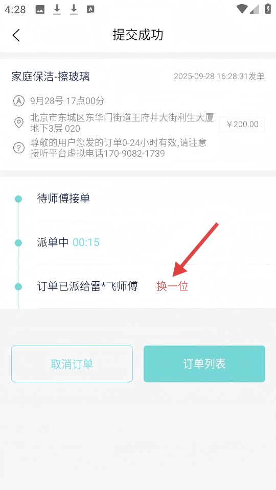 4、在订单提交成功页面,若对派单的雷*飞师傅不满意,可点击【换一位】,更换服务师傅。