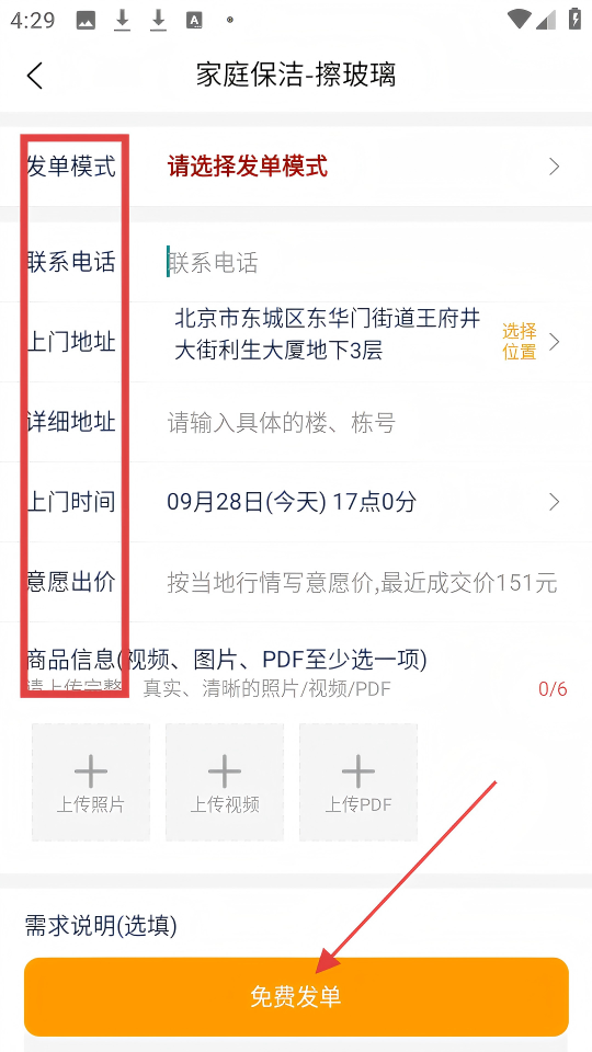 3、在家庭保洁-擦玻璃的发单页面,填写【发单模式】等信息,点击【免费发单】。