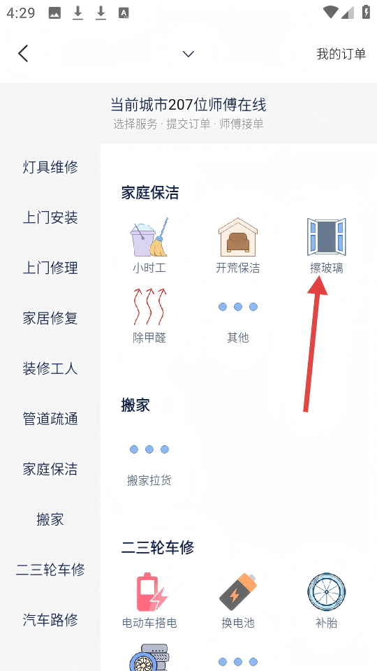 2、在服务选择页面,点击【擦玻璃】选项,可进入家庭保洁-擦玻璃的发单页面。