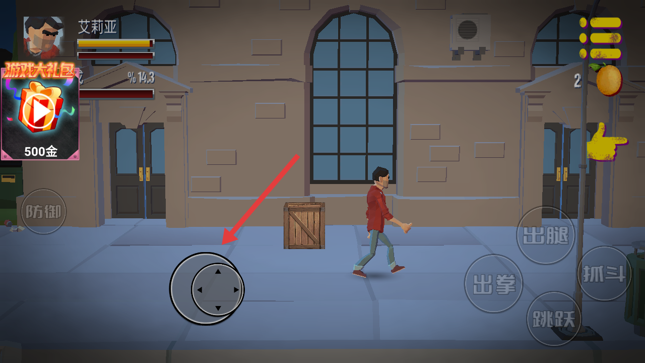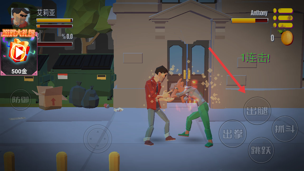 2、通过虚拟摇杆控制角色移动,利用出拳,出腿,抓斗,跳跃等按钮进行攻击。