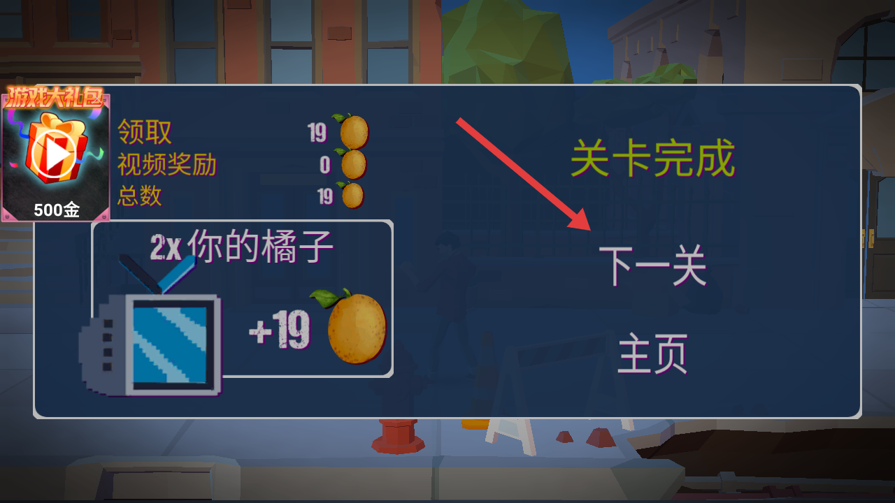 4、关卡完成后,点击下一关按钮继续挑战,积累橘子资源以提升角色属性,增强战斗力。