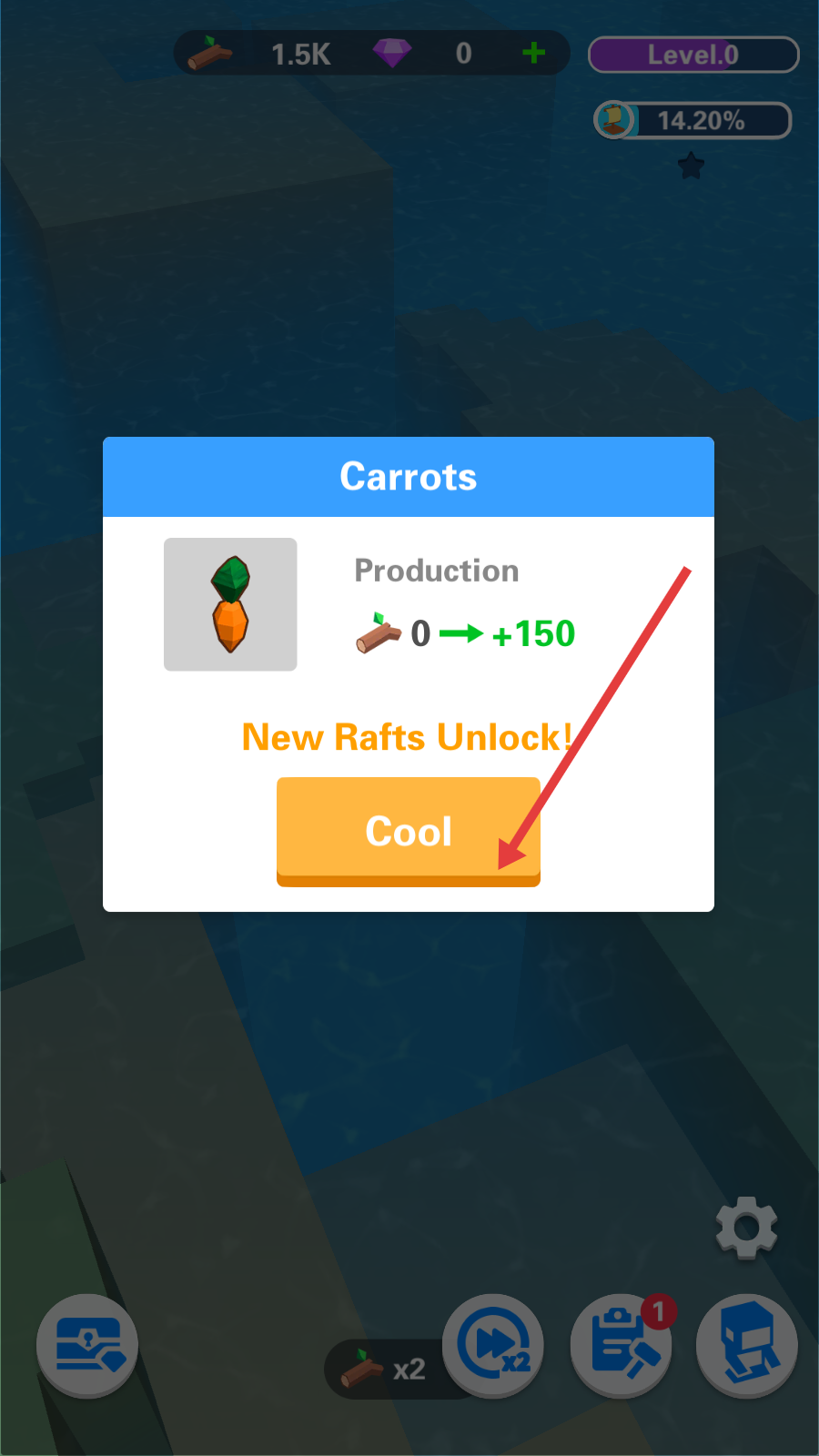 3、点击【Cool】,确认胡萝卜建筑解锁新木筏。