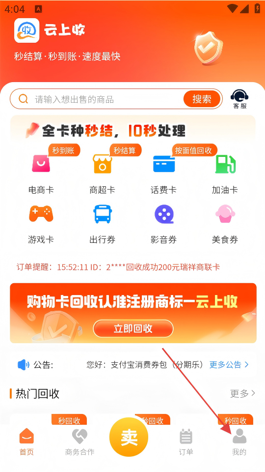 云上收是一款专业的一站式卡券回收平台,核心以多类型卡券覆盖、极速变现服务、安全备案保障与灵活结算方式为特色,帮助用户高效处理闲置卡券。它支持多种热门卡券回收,输入卡密即可一键操作,提供多种结算方式确保资金实时到账,可查看回收订单与提现记录,还能对卡券安全备案,保障资产安全,让闲置卡券快速转化为可用资金。