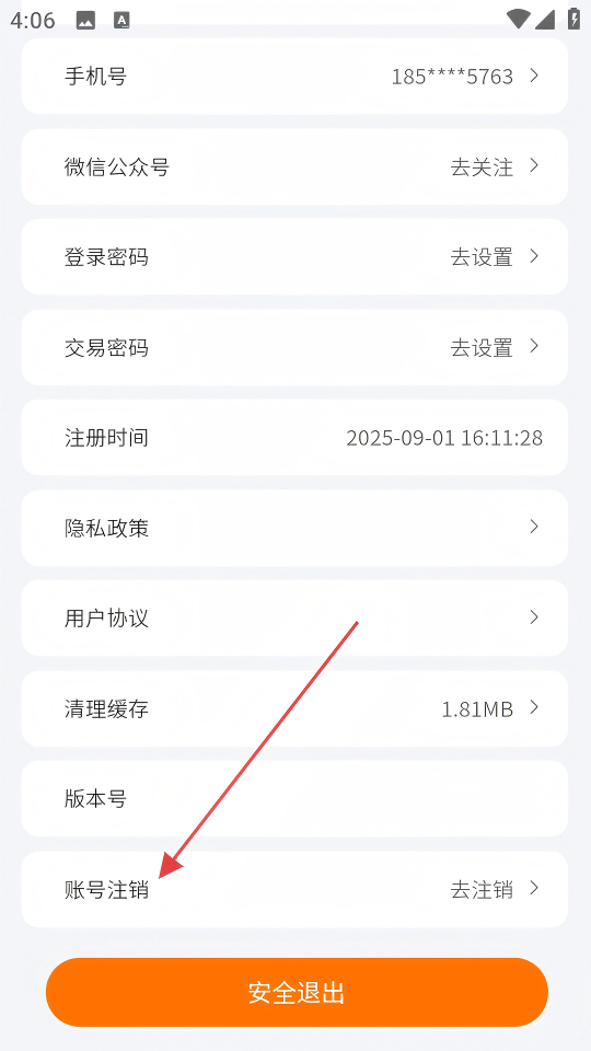 3、在设置详情页,点击【账号注销】,弹出“注销须知”窗口。
