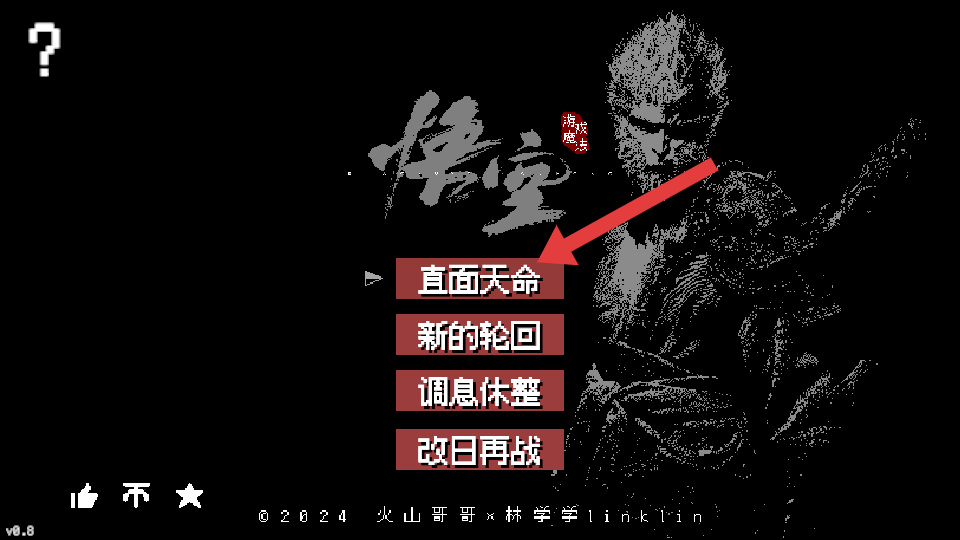 1、进入游戏后,选择【直面天命】开始挑战,开启像素风格的黑神话冒险之旅。