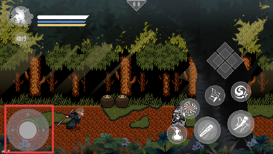 2、通过左侧的【虚拟摇杆】操控角色移动,在森林场景中探索,留意周围的敌人和道具。