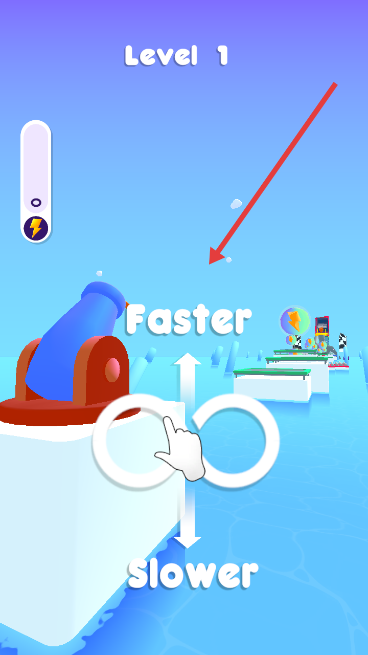 1、在第一关开始界面,通过滑动操作调整角色发射速度,选择Faster或Slower来控制发射节奏。