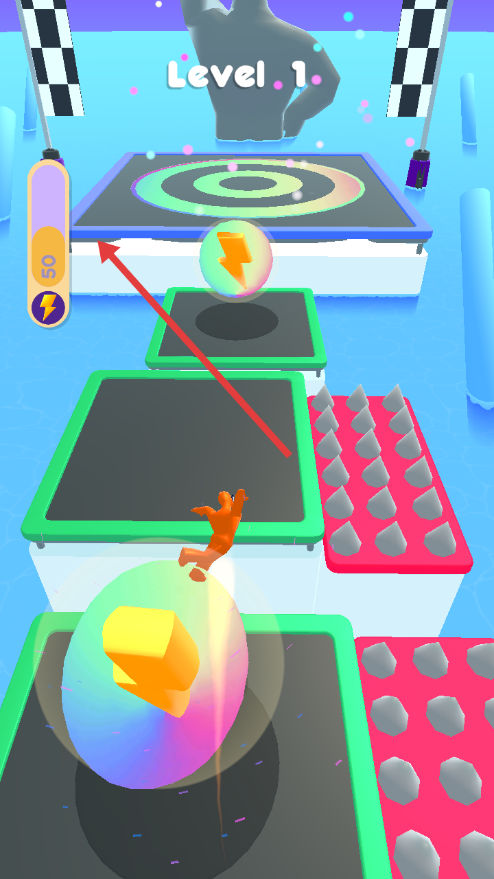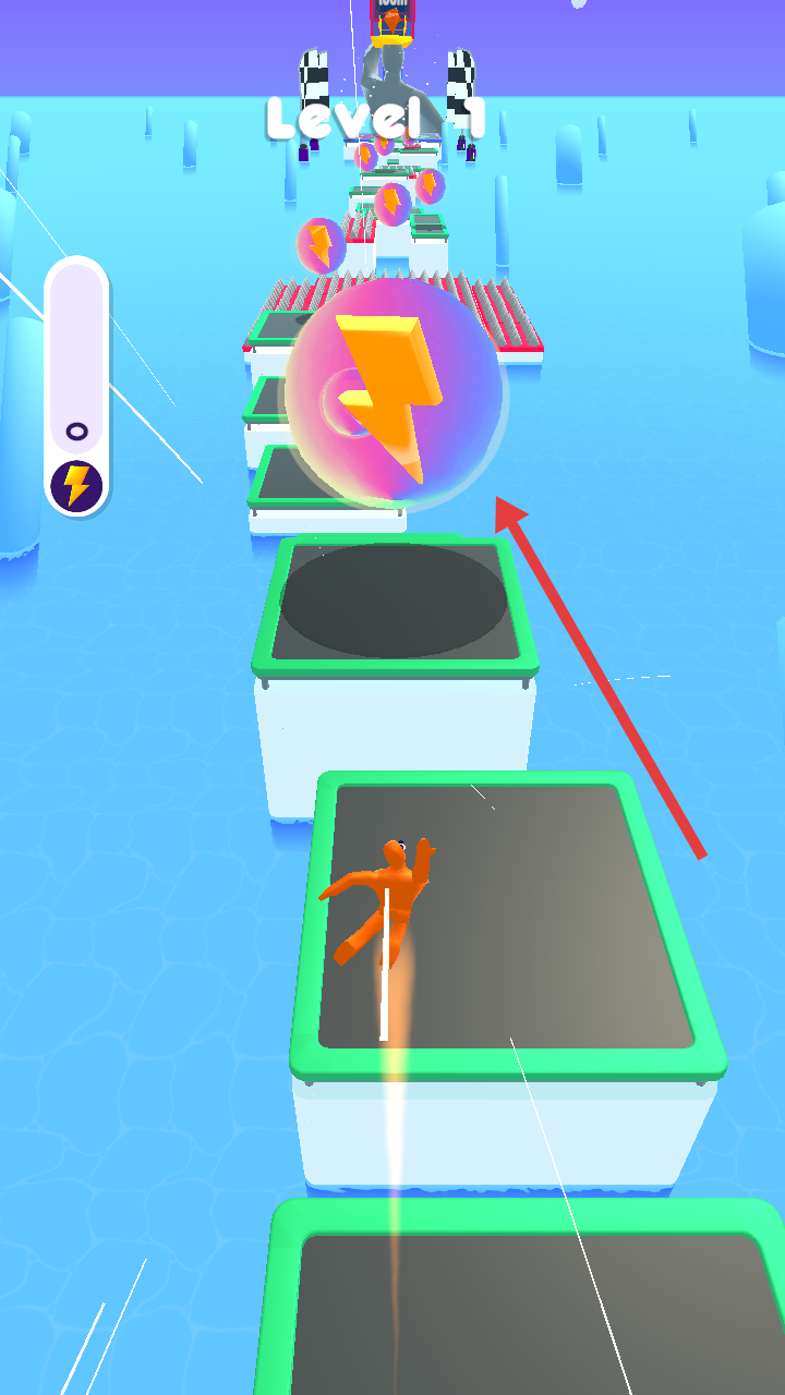 3、注意避开红色尖刺等障碍物,同时持续收集闪电道具,积累能量值。
