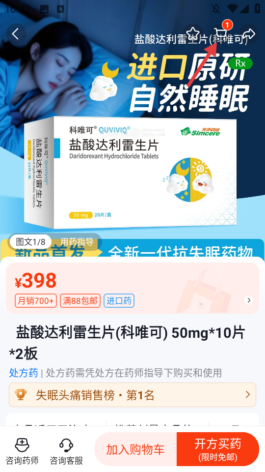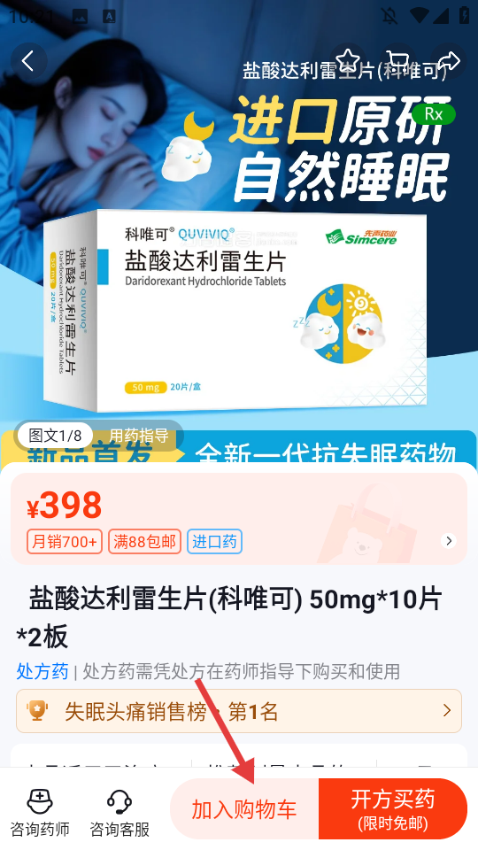 2、在商品详情页点击【加入购物车】,将药品添加到购物车。