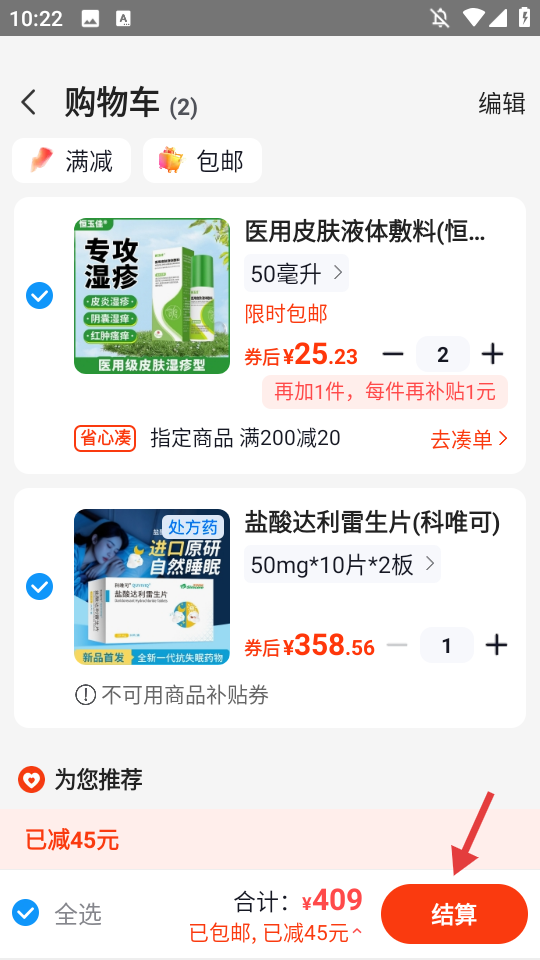 4、进入购物车页面,勾选商品后点击【结算】,完成订单结算。