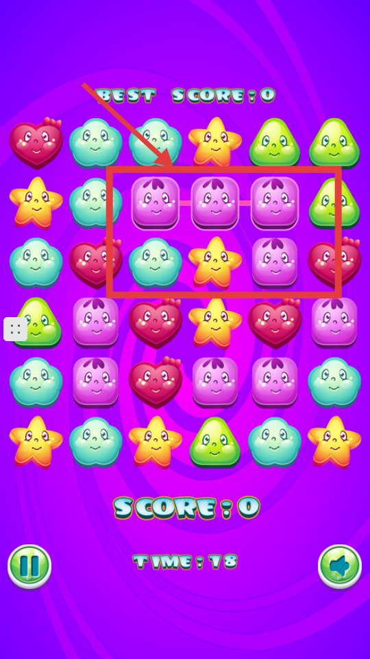 2、在消除界面,寻找相同样式的卡通糖果,连线消除它们,获取分数。