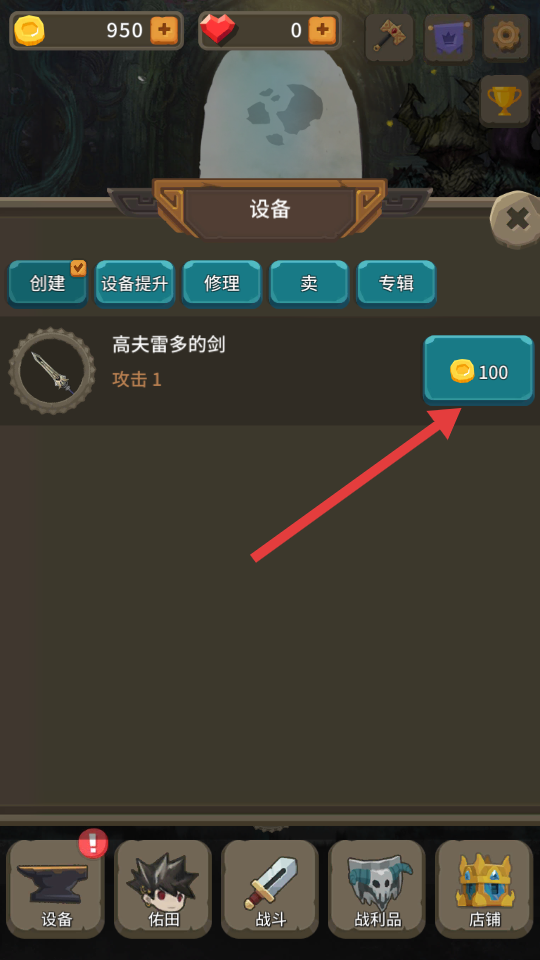 2、在设备界面,点击对应装备旁的金币按钮(如“高夫雷多的剑”旁的【100】金币按钮),进行装备购买。