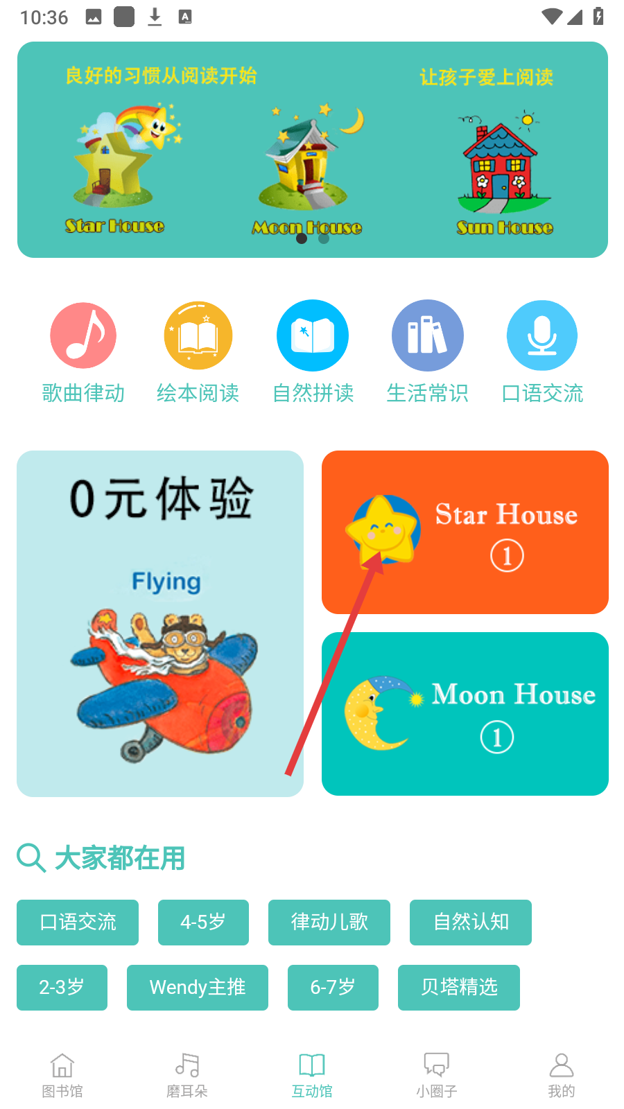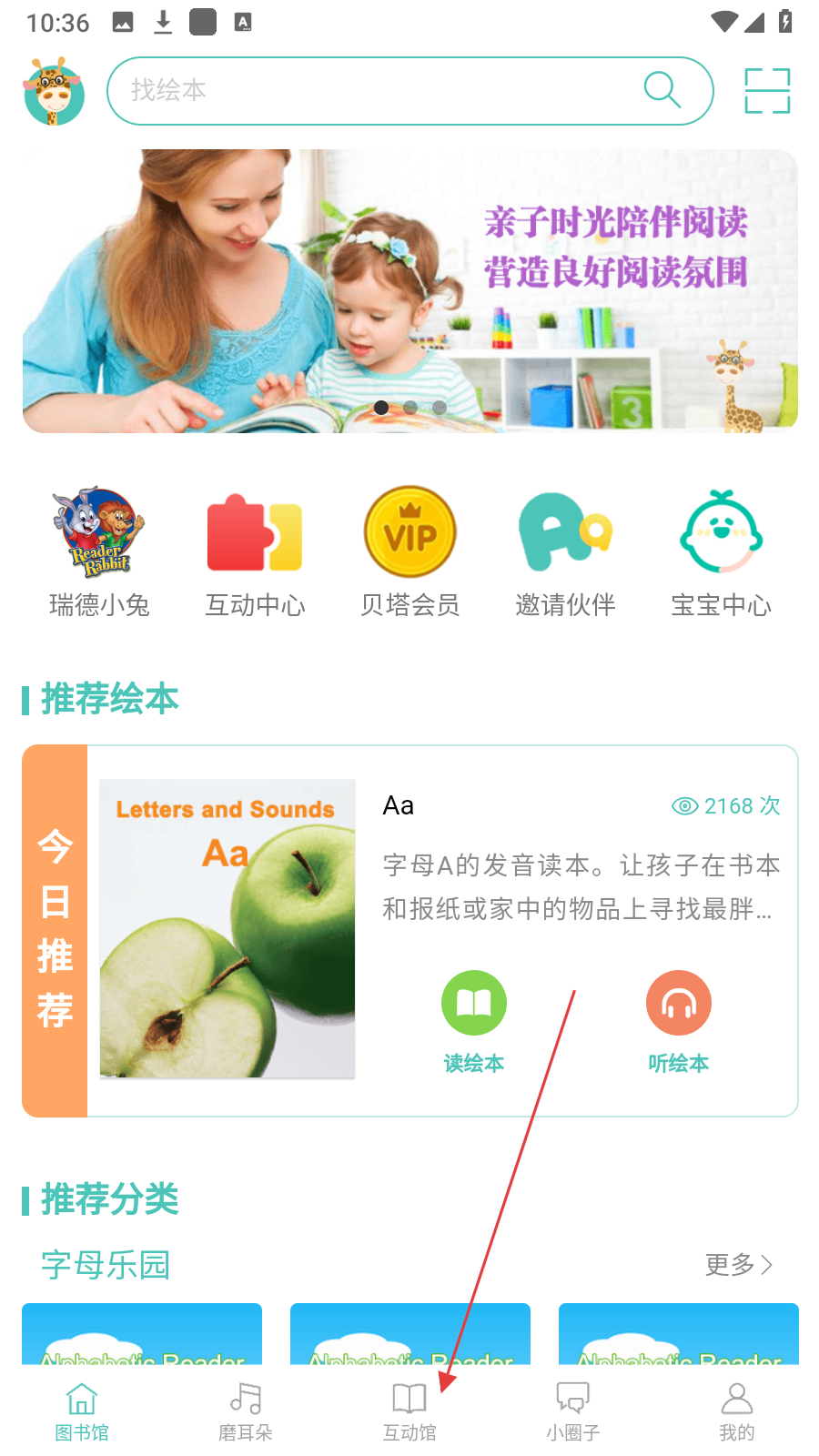 1、在图书馆页面,点击底部【互动馆】,进入互动馆页面。