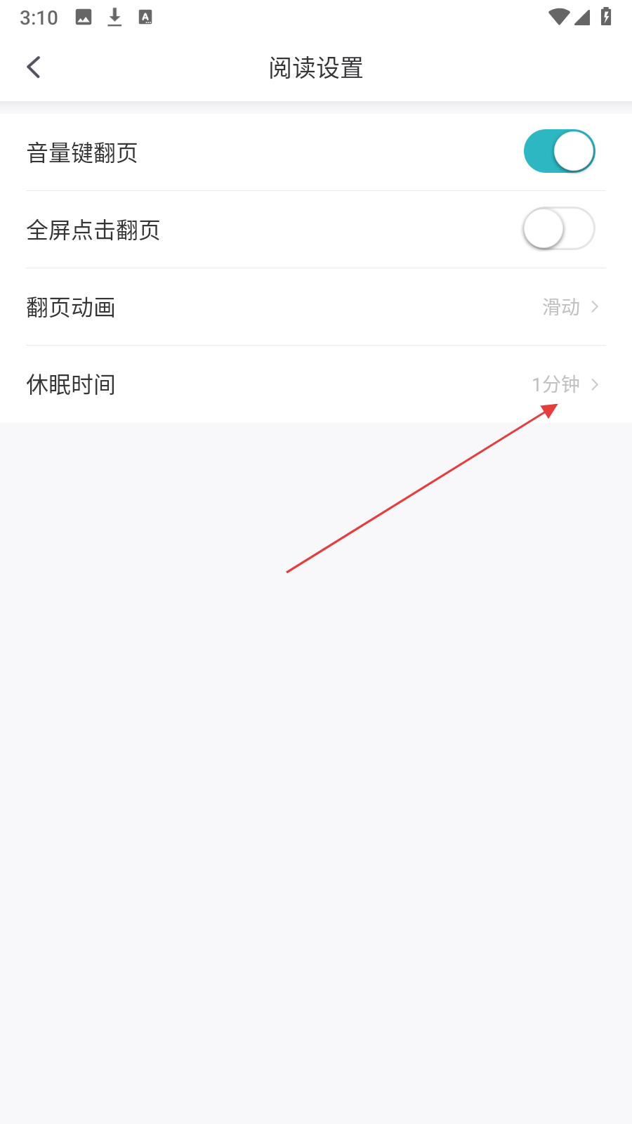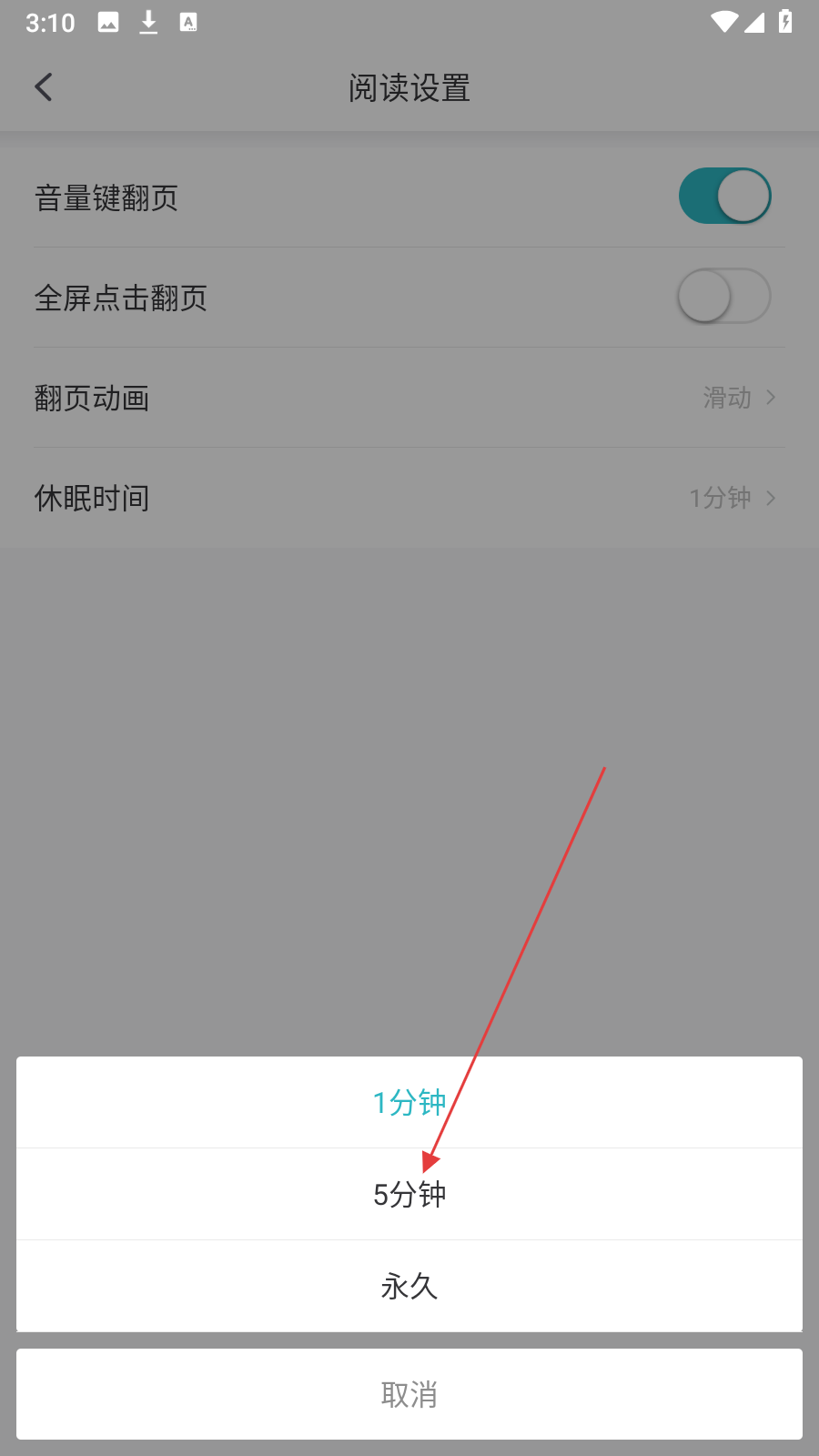 3、在阅读设置页面,点击【休眠时间】,弹出休眠时间选择框。