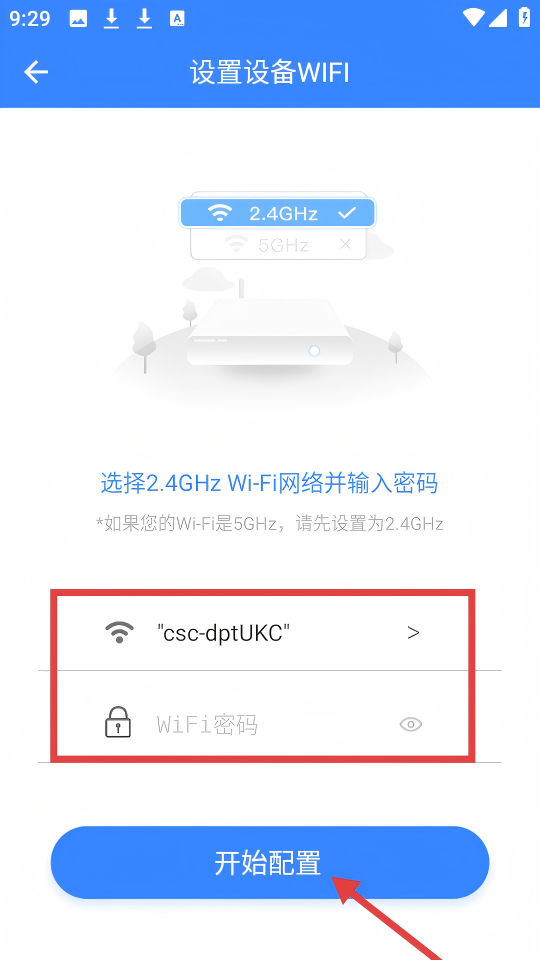 4、在【设置设备WIFI】页面,选择2.4GHzWi-Fi网络,输入WIFI和WIFI密码,点击【开始配置】按钮。