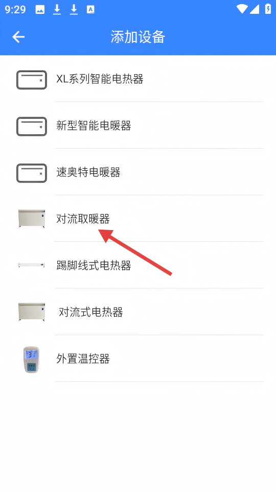 3、在【添加设备】的设备类型列表中,点击【对流取暖器】,进行该设备的添加。