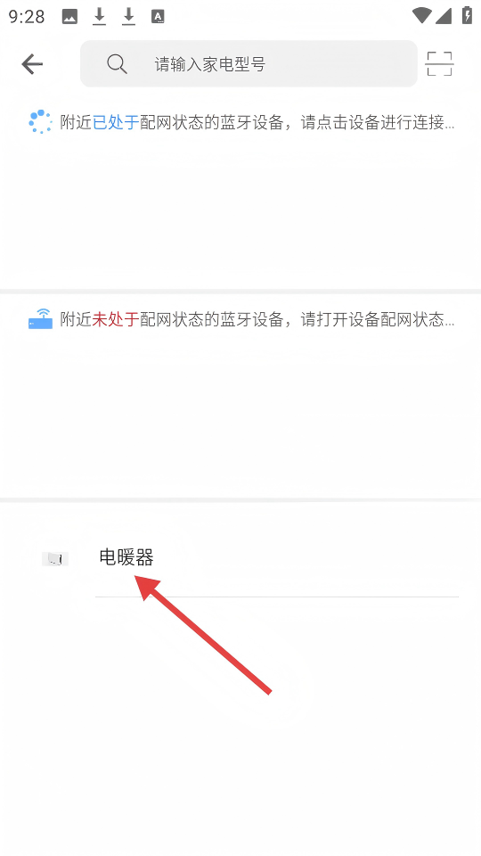 2、在设备选择页面,点击【电暖器】选项,进入具体设备类型选择。