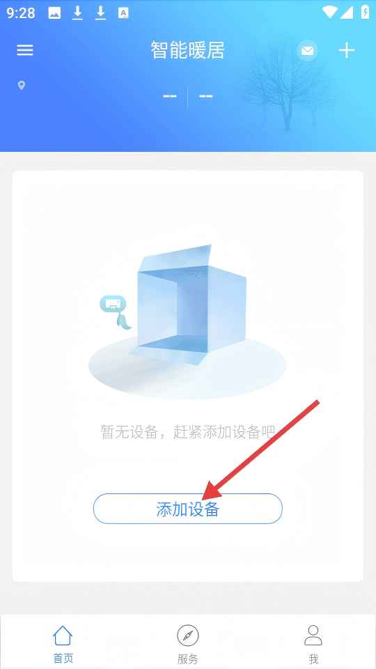 1、在【智能暖居】首页,点击【添加设备】按钮,开始添加设备操作。