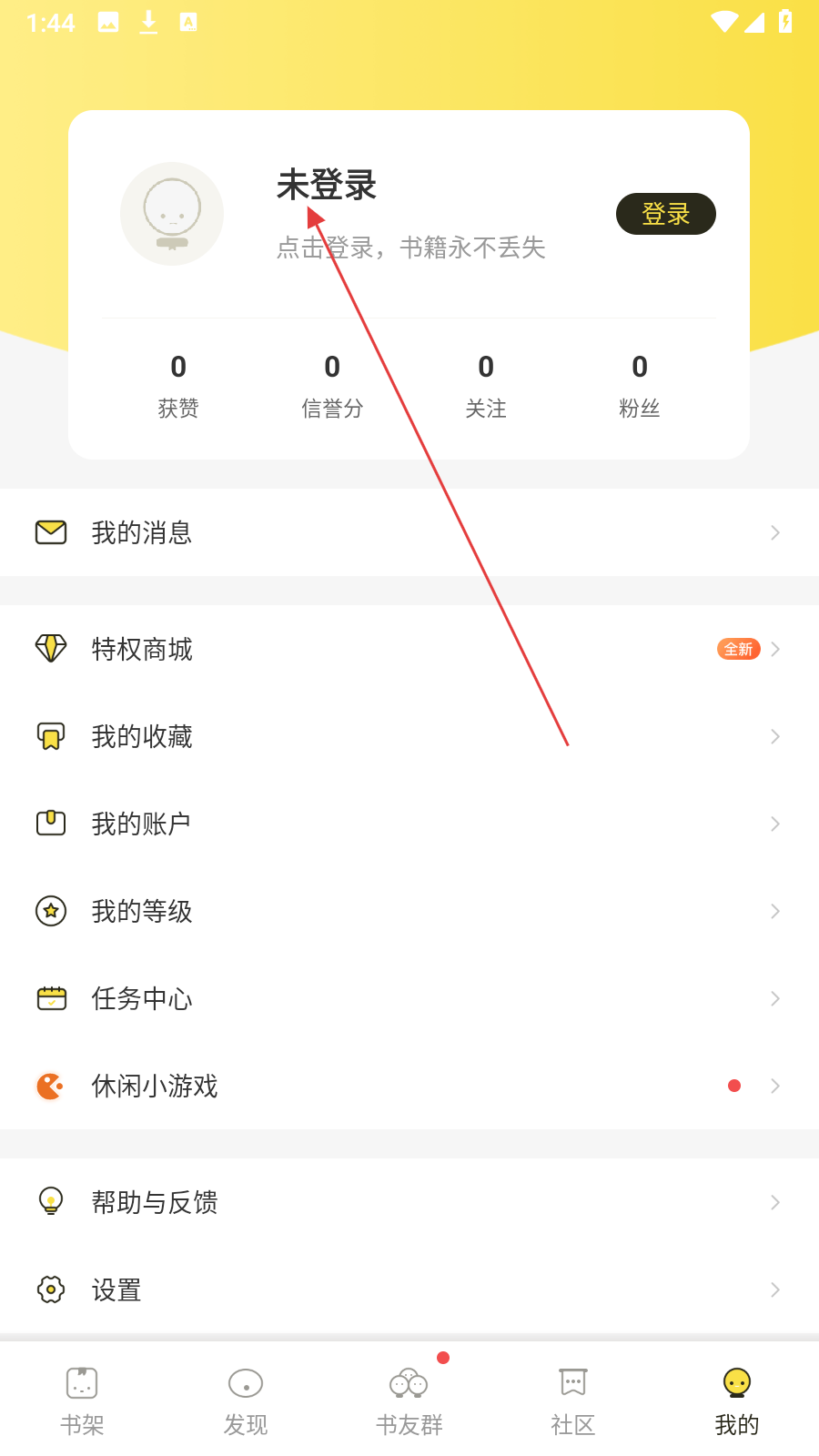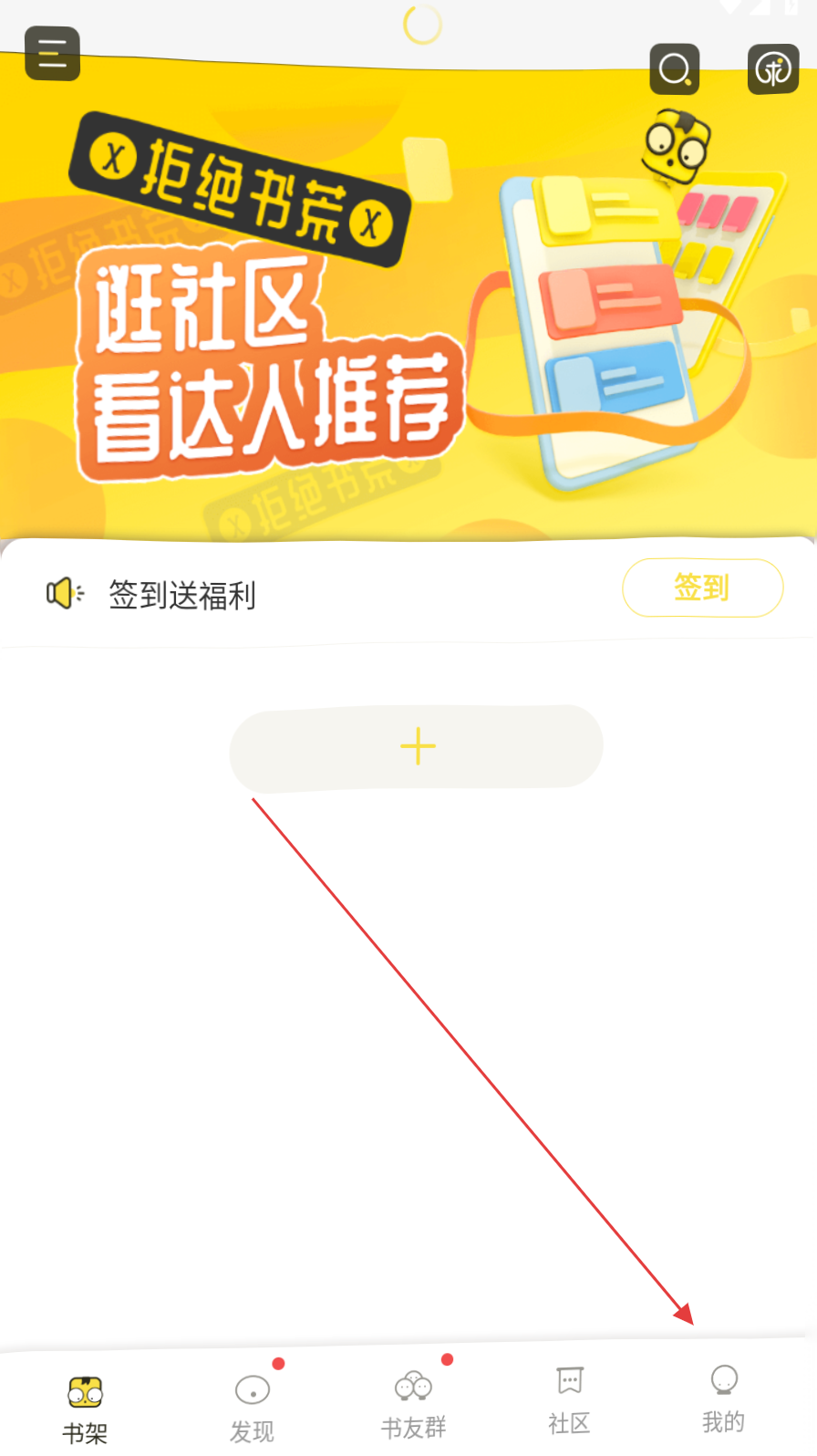 1、在书架页面,点击右下角【我的】,进入个人中心页面。