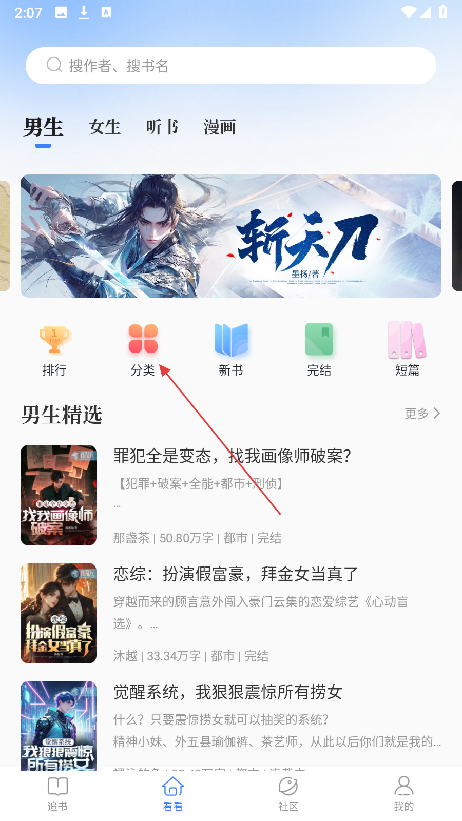 1、在首页,点击【分类】图标,进入书库分类页面。